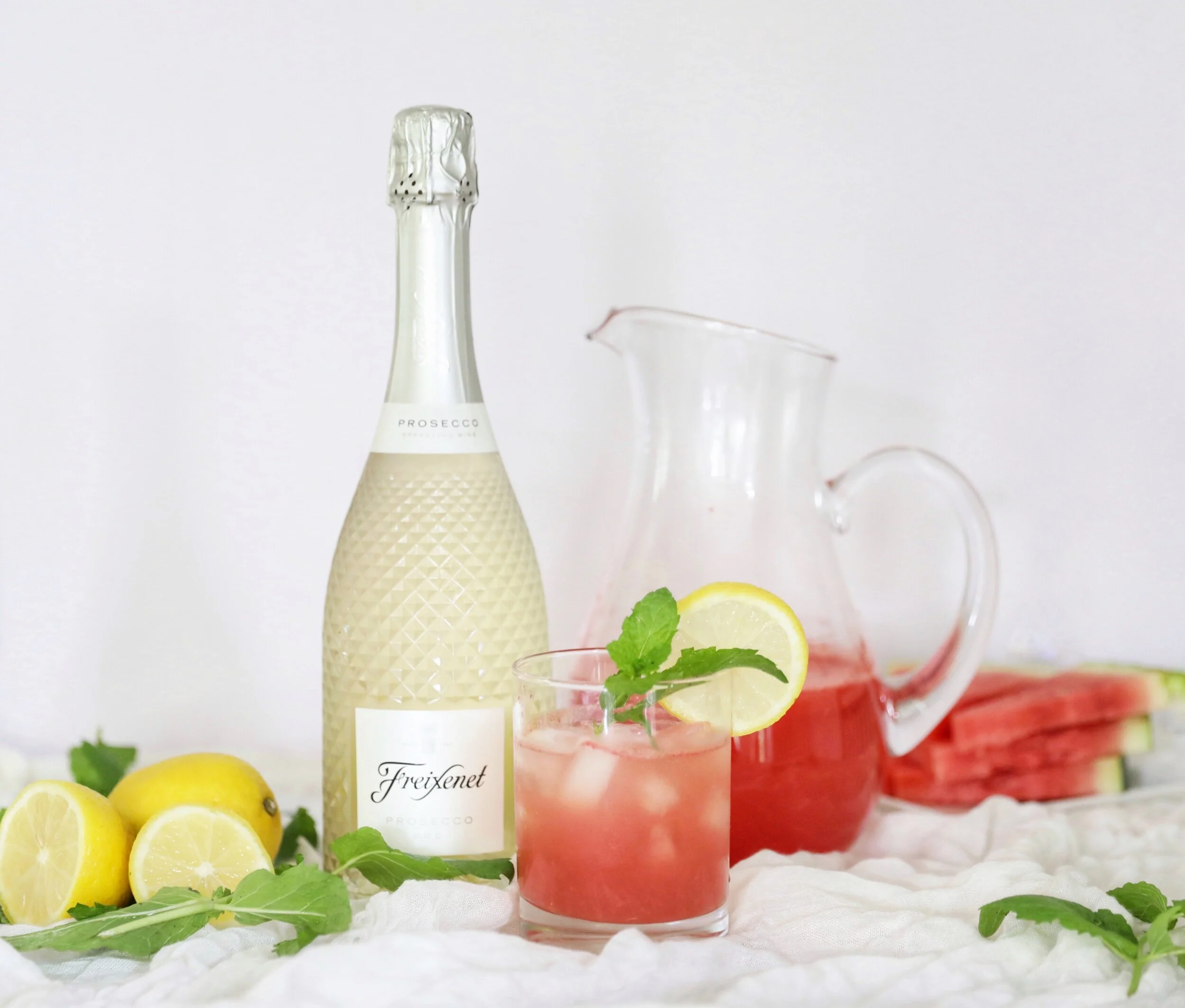 One of my favorite things to do in the Summer is sit on the patio with friends and make a big pitcher of something delicious. Most of the time that pitcher includes some bubbly.