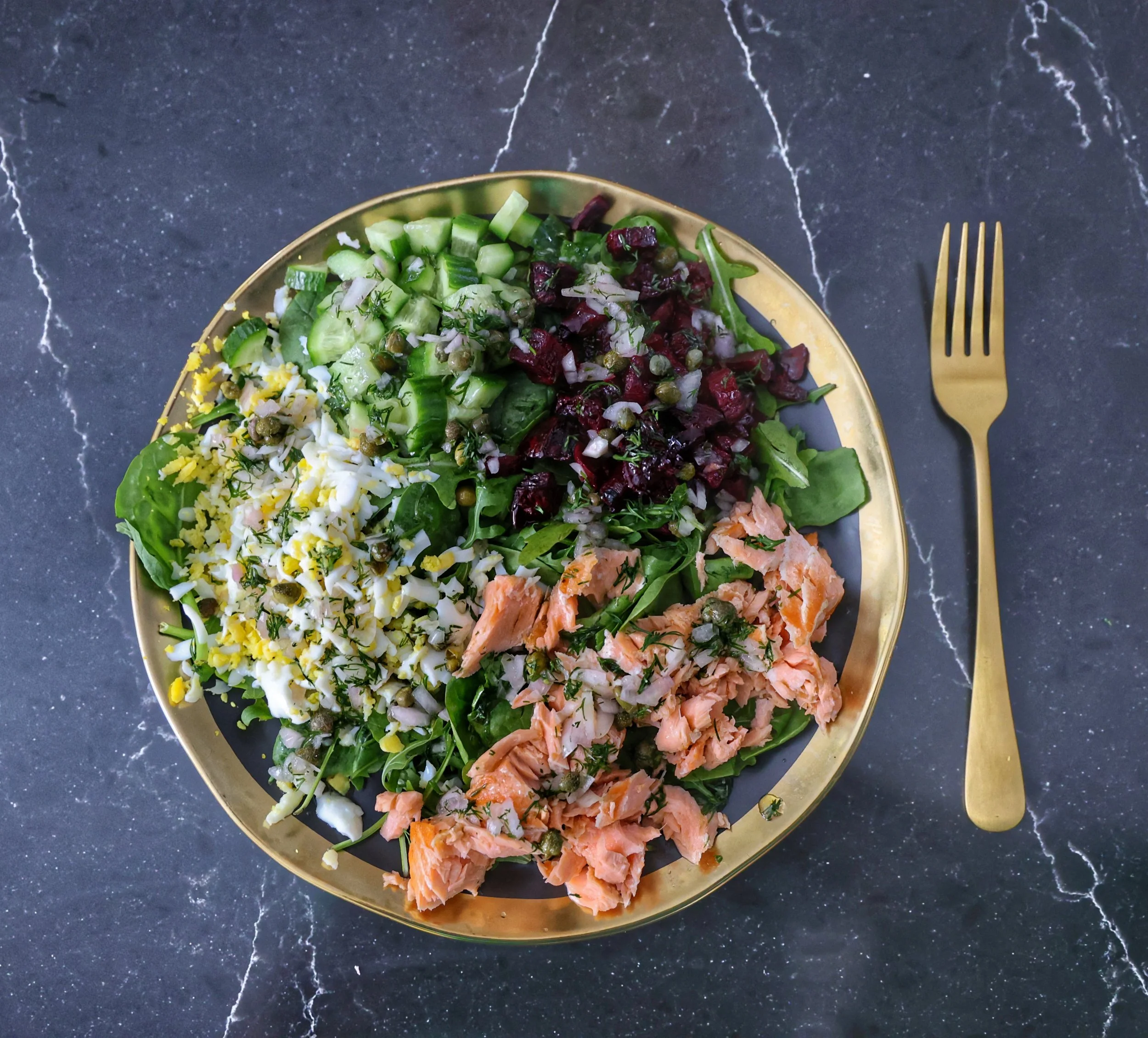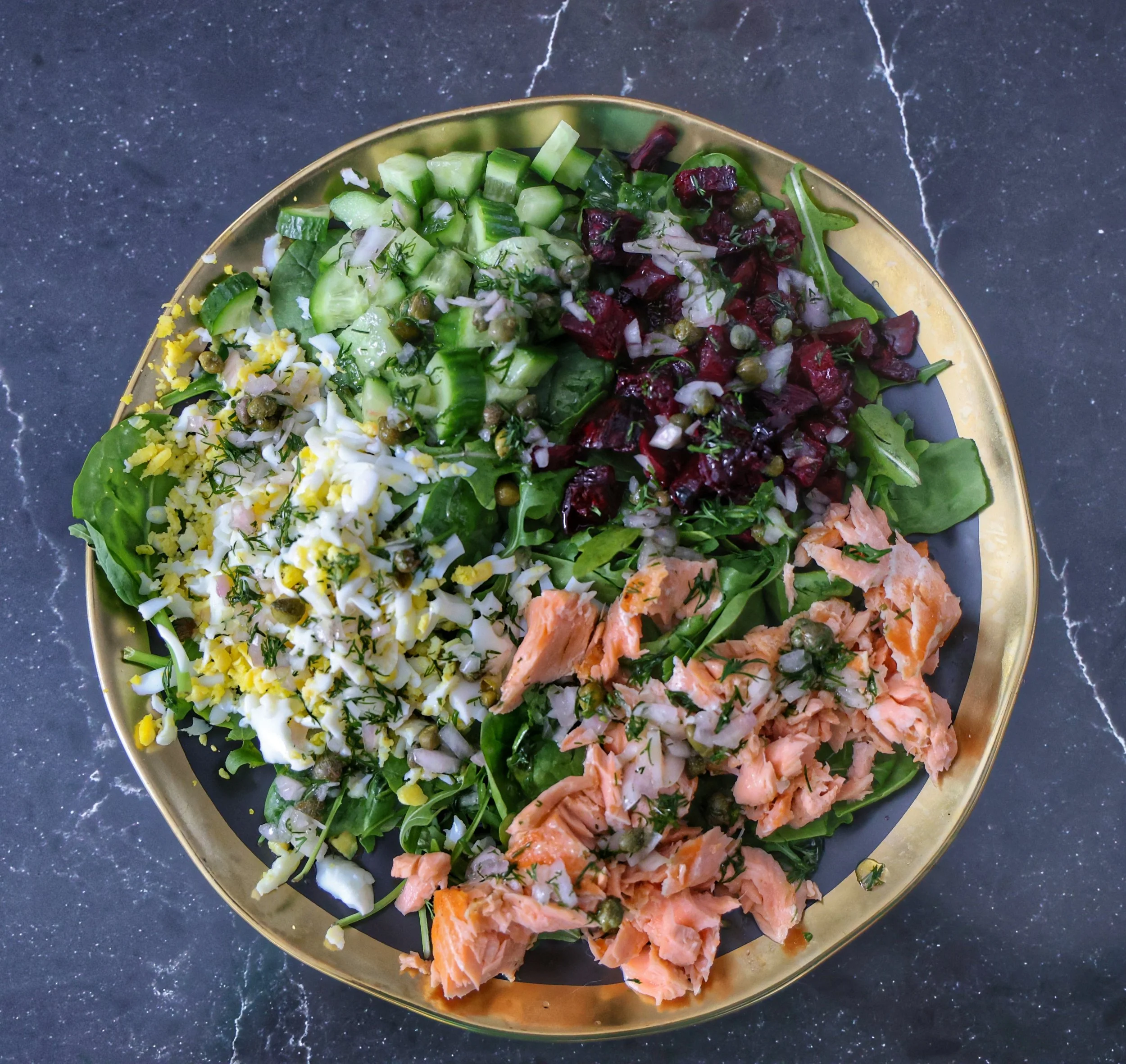 Cook your salmon as you wish. I pan fried mine in oil and shredded it. Add beets to a bowl, add 1/8 tsp salt, cover and microwave until tender. Mine took about six minutes. Assemble your salad. Add greens of choice, beets, eggs, salmon, and I added cucumber which this recipe didn’t call for but I love mini cucumbers and felt it added to this dish. Add your dressing and top with fresh dill.