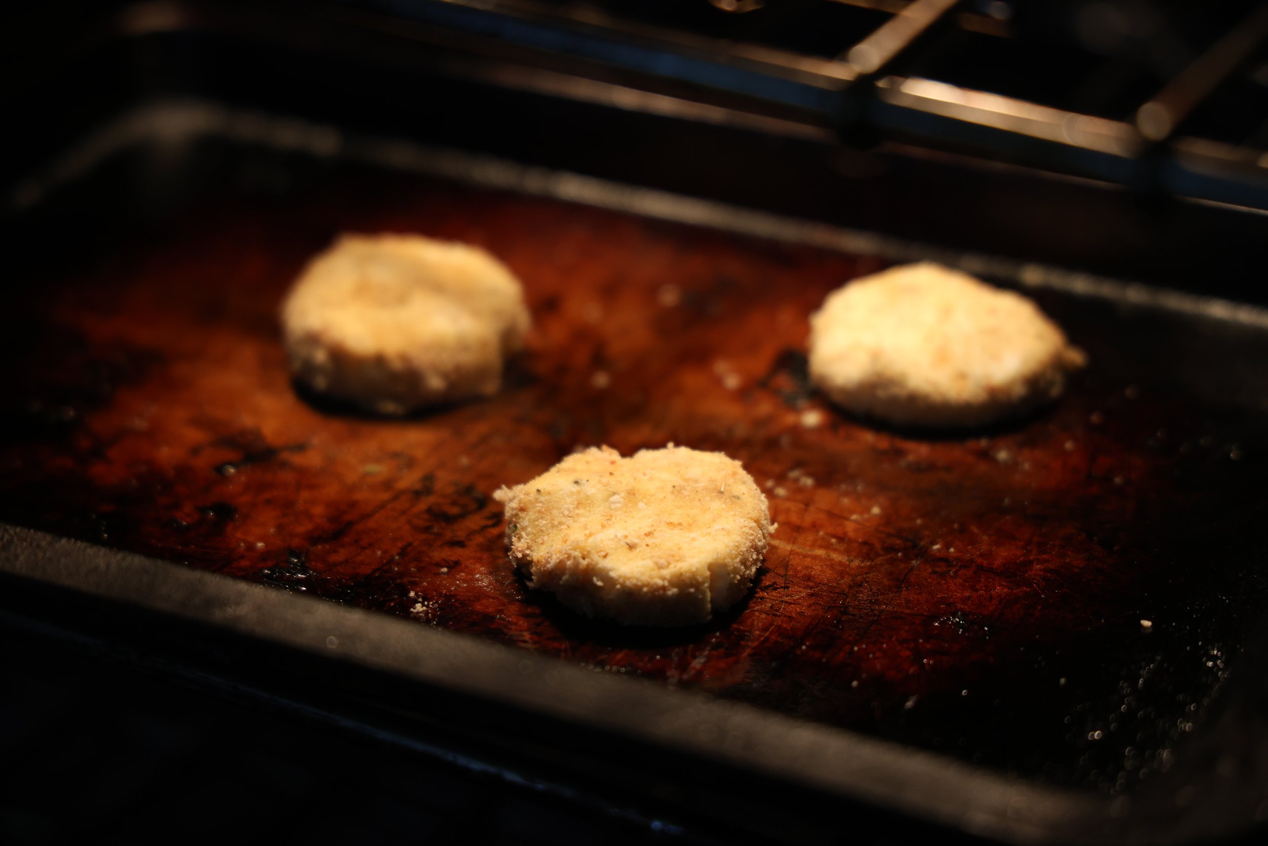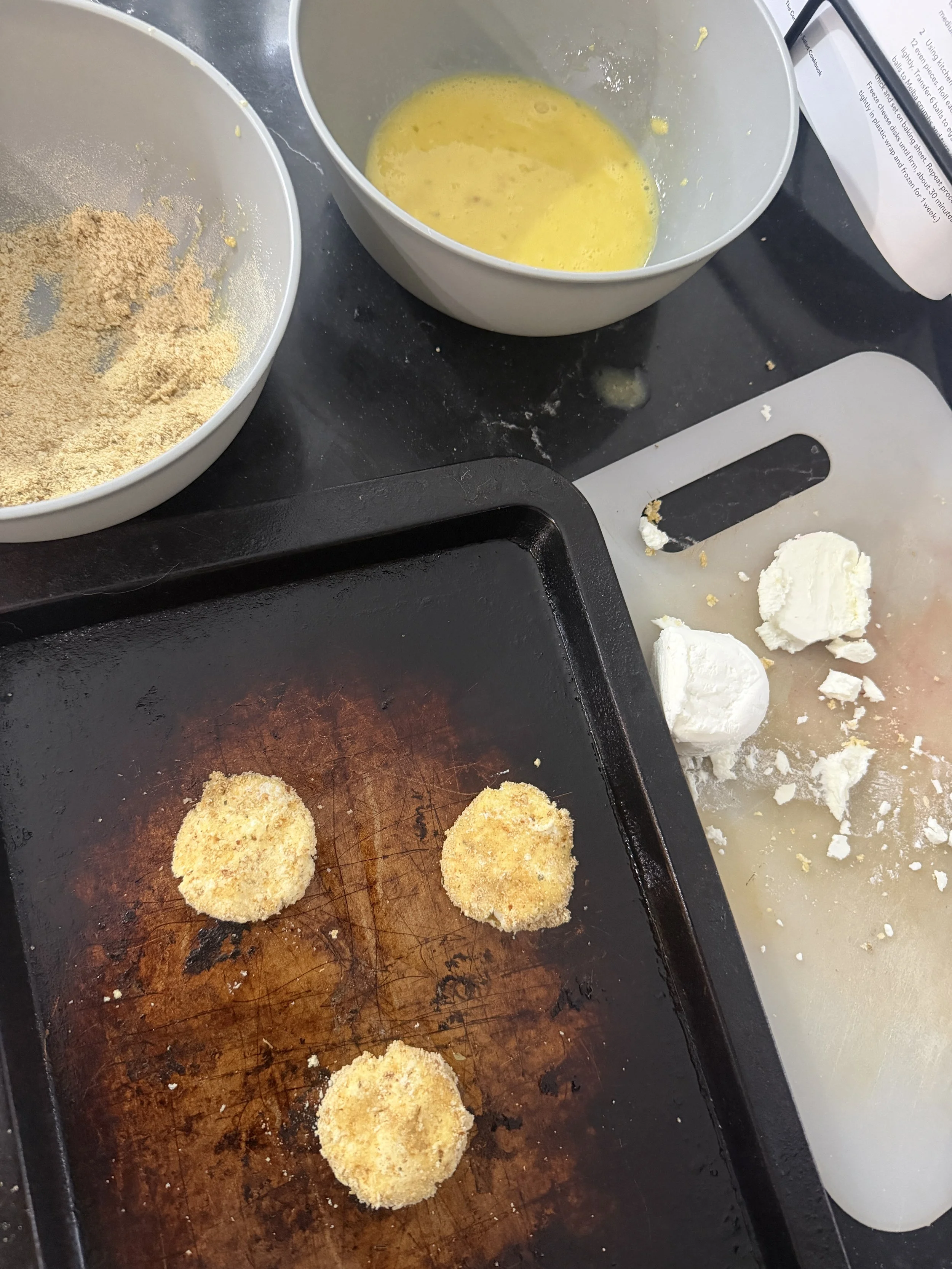 Add Dijon mustard to the egg and whip. Roll desired pieces of goat cheese into balls with herbs, dip them in the egg and then breadcrumbs. And press them into a sheet pan. Put them in the freezer for 30 minutes. While they’re cooling preheat the oven to 475 degrees and start your salad and dressing.