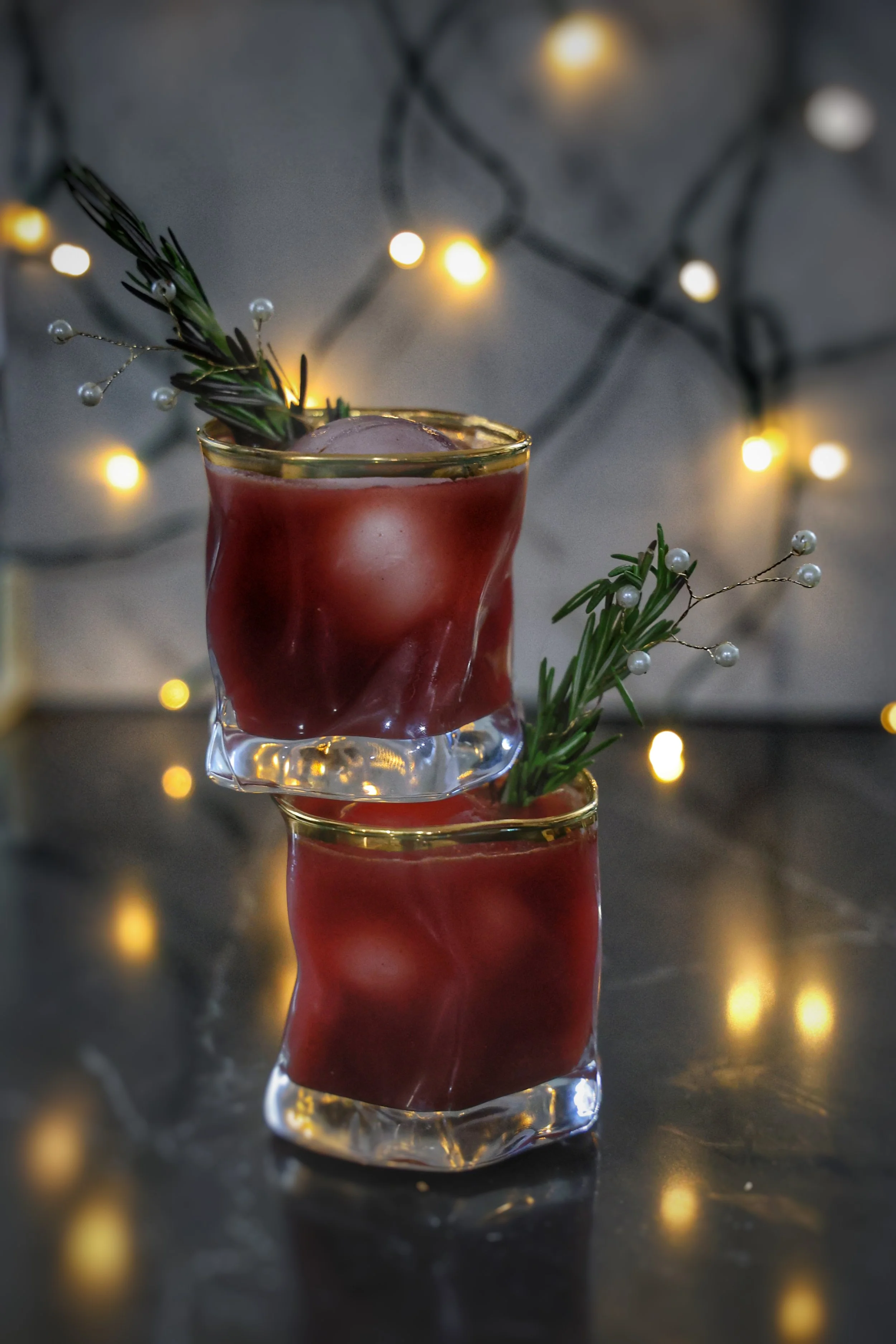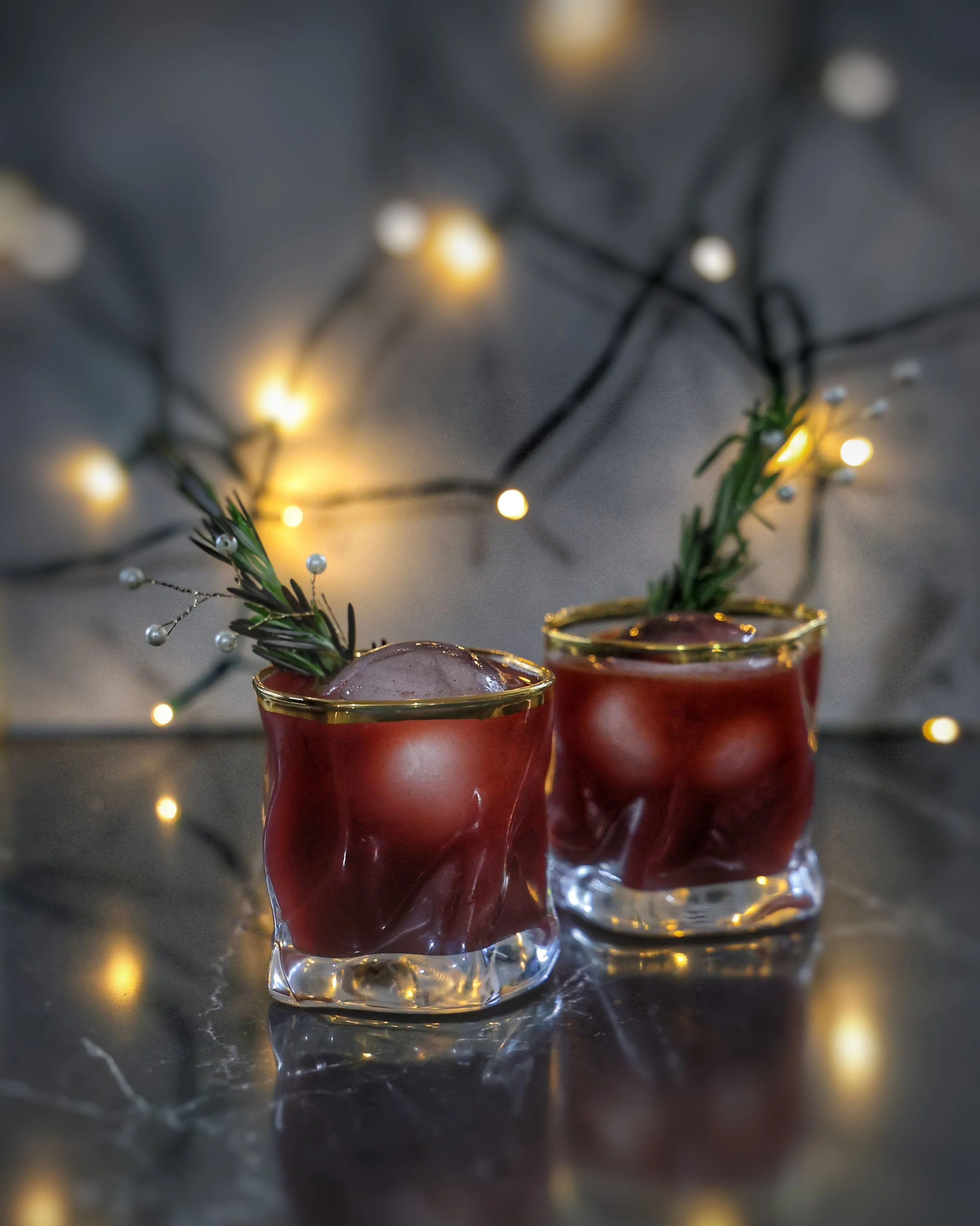 Simple! Fill a shaker with ice, add in everything and shake, shake, shake! Then, pour into two, possibly smoked, glasses. I used two big ice orbs because they make me feel fancy. Garnish with fresh rosemary.