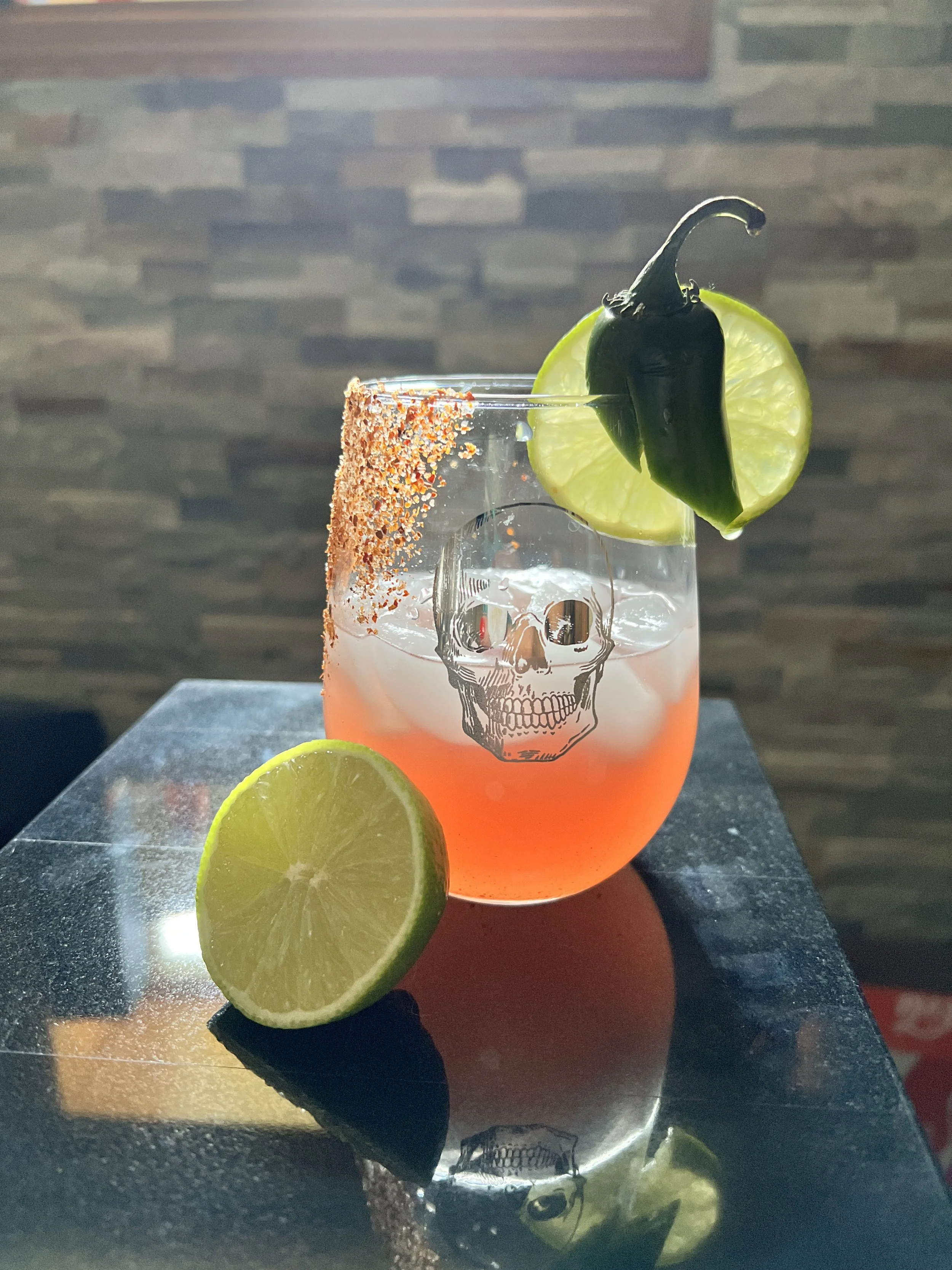 Rim the glass with Tajin, garnish with jalapeño and lime.