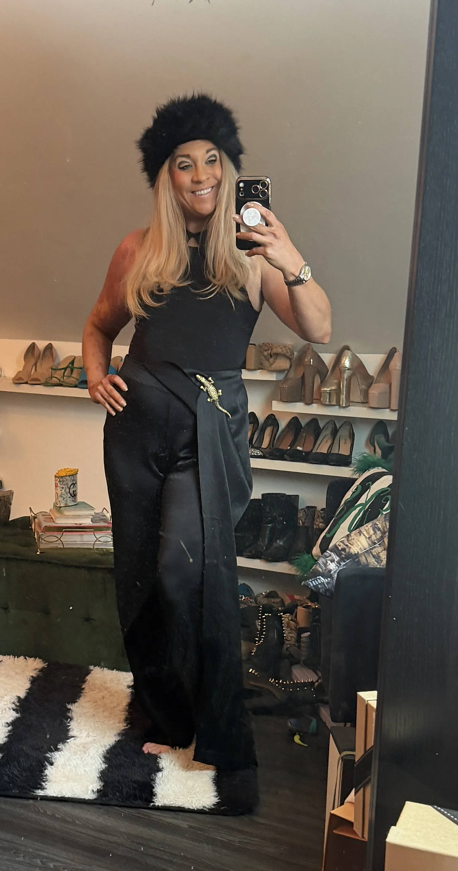 I always have a favorite look of the week and this was it. Something that’s really trending ow is polka dots. It’s nice to have another pattern to mix in with your closet. I love faux fur and this vest is so colorful and fun. Most certainly dopamine dressing. A colorful pant is one of my favorite things. These leopard boots have been through the wringer but I love them. Sadly, they are on their way out. I threw on some gold jewelry for the finishing touch. Clearly I’m very into gold at the moment.